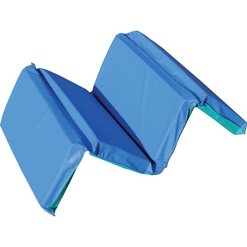 "Rest assured" with these heavy-duty heat sealed mats. Easy to disinfect...all seams completely sealed using radio frequency technology. Soothing blue/teal color combination. Durable, waterproof, 10-mil vinyl. Four-section mat. One year warranty. 2"x 24"x 48" - Folds to 12"x 24" - Blue/Teal combo