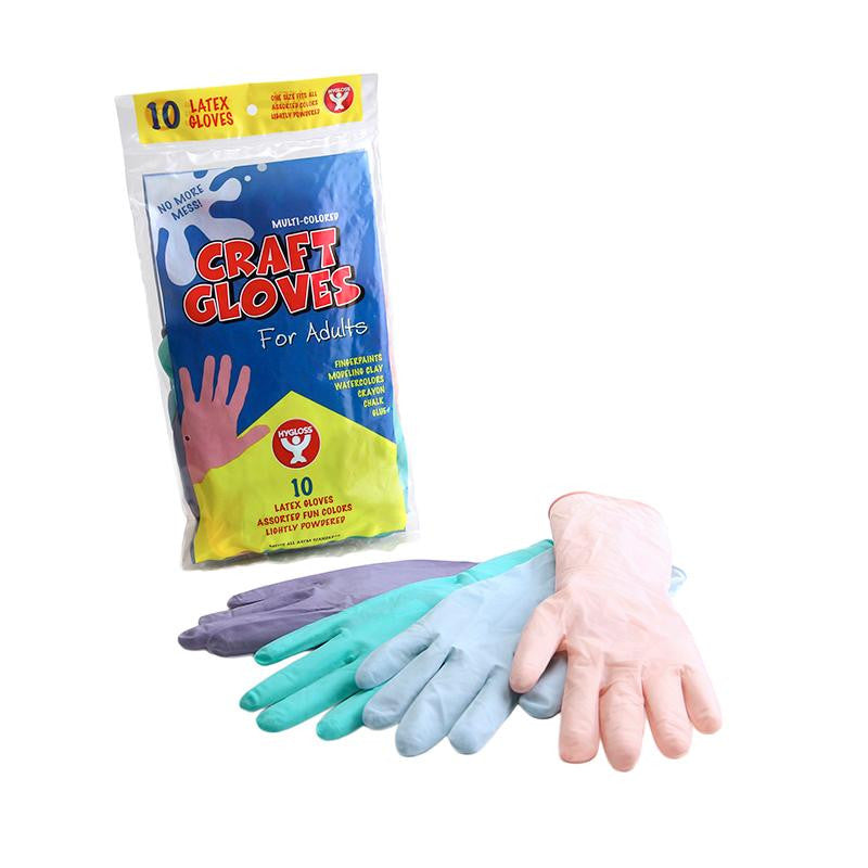 Brightly colored, easy to use latex gloves. Excellent for painting, gluing and other craft projects. Keeps hands clean and prevents the spread of germs. Easy clean-up for messy projects.