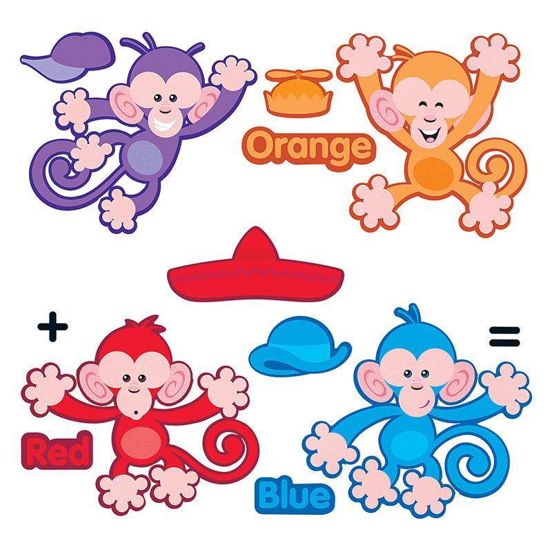 Merry monkeys with matching hats are ready help teach 11 colors and color words: red, yellow, blue, orange, purple, green, black, white, brown, gray, and pink. Use the plus and equal signs to show how primary colors blend to make secondary colors. 48 pieces, up to 8".