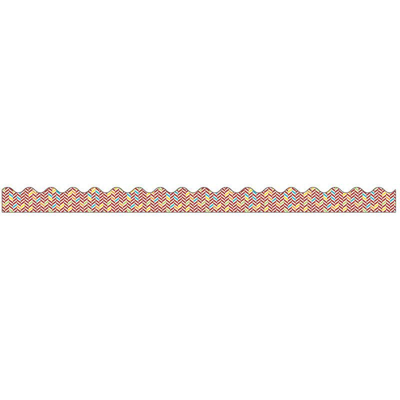 Add a contemporary touch to your classroom with the Hipster collection. The Hipster Herringbone scalloped border features a colorful herringbone pattern that complements any classroom display. --A simple solution for accenting classroom displays, bulletin boards, windows, and doors, scalloped borders provide an easy, affordable way to create a colorful classroom. Each pack features 13 strips that measure 3 feet x 2.25 inches for a total length of 39 feet. Use these borders individually or cut and layer them to create your own special style. Be sure to look for other coordinating products to create a cohesive classroom theme!