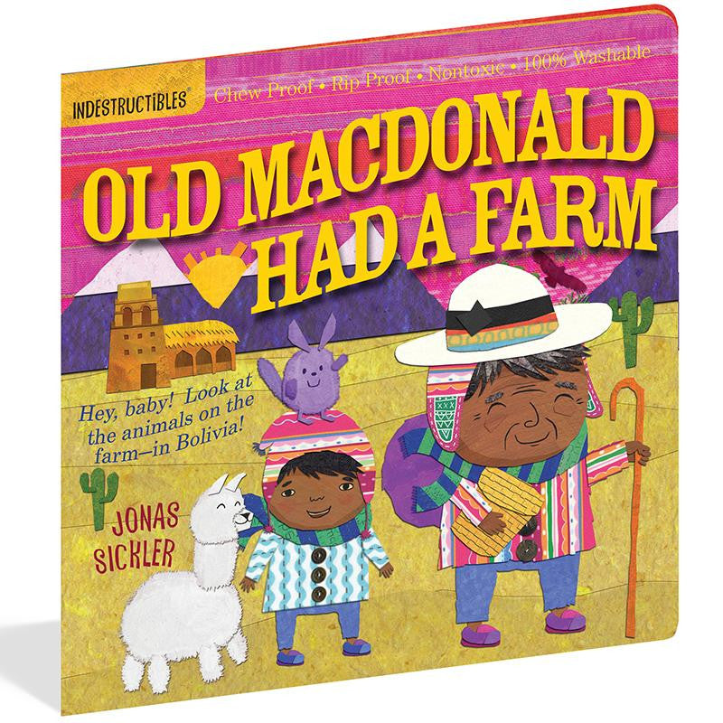 The title is adapted from classic nursery rhymes and illustrated by Jonas Sickler. Sickler's paintings are whimsical and fun, filled with dazzling textures and eye-popping color. They will grab and keep a baby's attention, and delight adults. The book offers a multicultural twist on a classic nursery rhyme, Old MacDonald Has a Farm, set in Bolivia is full of llamas, alpacas, sheep, and cows. The text for the nursery rhyme is printed on the back cover.