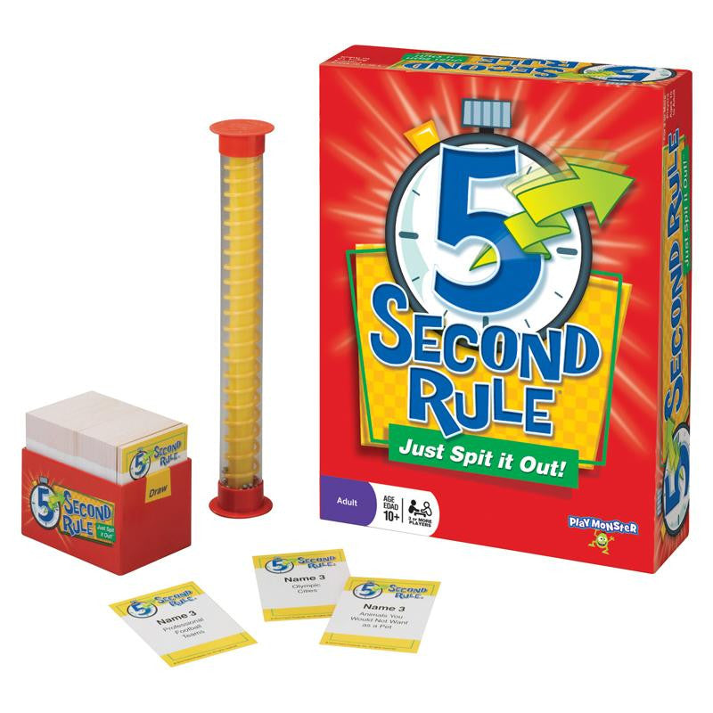 It should be easy to name 3 breeds of dogs - but can you do it under the pressure of 5 seconds twisting down, and with the other players staring at you, waiting for you to get flustered? Time's not on your side, so just say what comes to mind and risk ridiculous answers slipping out as time twirls down on the unique twisted timer! It's all in good fun with this fast-paced game where you have to Just Spit It Out!™