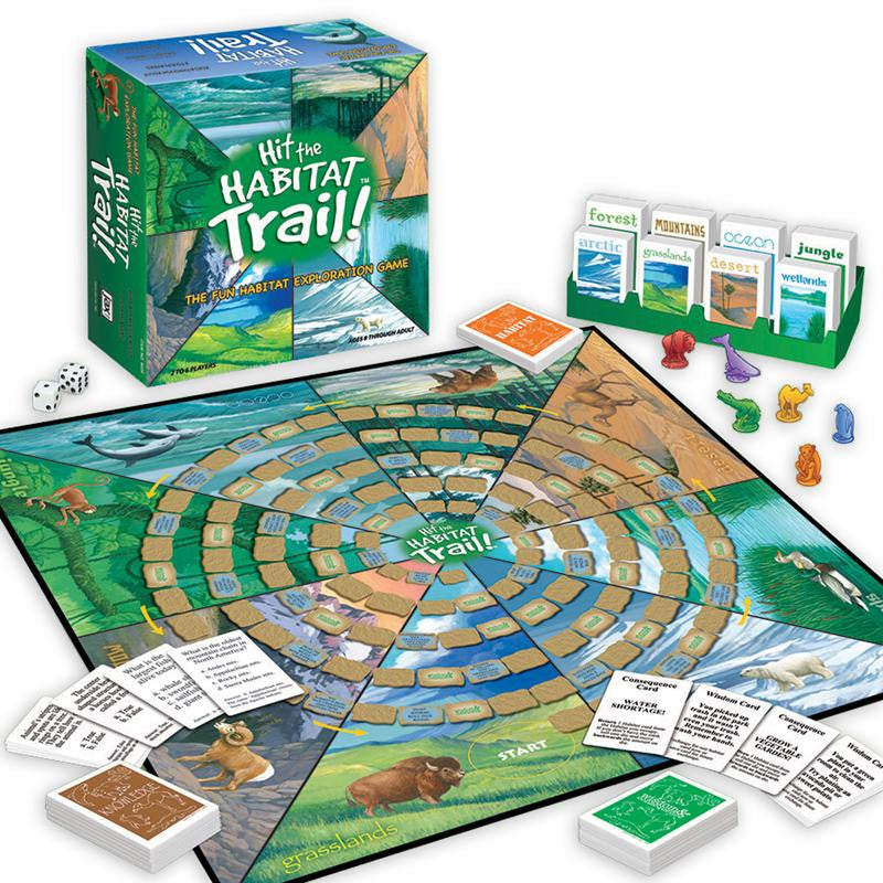 Learn about animals and their environments as you follow the stone trail through the world's habitats. Draw a "Wisdom & Consequence" card to learn about environmental hazards and to discover ways in which you can help improve the environment. With every correct answer to an animal or habitat question on the "Knowledge" cards, you collect one "Habitat" card. Collect two cards from each habitat to become an "Earth Steward" and win the game. It's a fun expedition around the world for family and friends when you "HIT THE HABITAT TRAIL!"