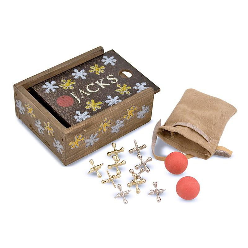 This, classic playground game, has been enjoyed by children for hundreds of years. Now it's time for a new generation to discover the fun! This set includes five silver and five gold jacks, plus two rubber balls. Store the set securely in a handy suede-like pouch that fits neatly in an heirloom quality solid-wood box with a sliding lid! A detailed instruction booklet is included.