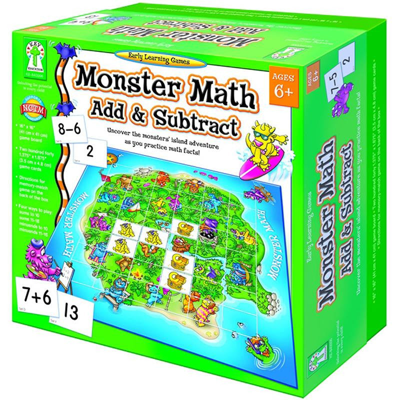 Take part in an island adventure that is both fun and challenging! Determine which basic facts children need to master and then select the cards for one of four skill levels: sums to 10, sums 11 to 18, minuends to 10 and minuends 11 to 18. Players take turns uncovering the board by answering and matching game cards correctly and see the funny antics of delightful monsters. This colorful memory-matching game includes a game board, 240 game cards, and directions. It also supports NCTM standards.