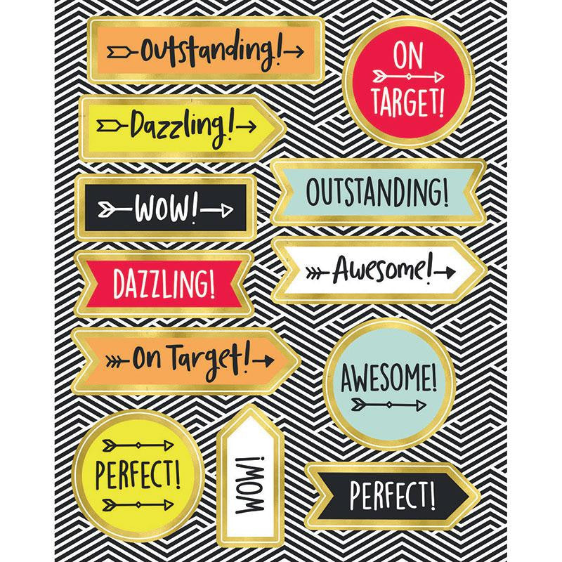 Inspire students to be their best with the Aim High motivators. Each motivational sticker features one of the these positive messages: "Outstanding," "Dazzling," "On Target," "Wow," "Awesome," or "Perfect." Motivational stickers can be added to completed assignments to reward a job well done. Each pack includes 6 sheets of 12 die-cut stickers, and all stickers are acid-free and lignin-free, perfect for photo projects or scrapbooking! Make sure to view our other Aim High products to create a cohesive classroom theme.