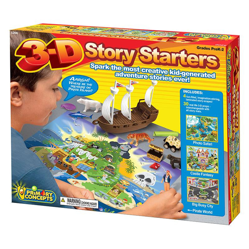 Never again will your students be at a loss for story ideas! Let their imaginations run wild as they fashion fantastic adventures with these realistically detailed miniature objects and intricately illustrated, language-provoking story mats. Just place the objects on a mat, and watch the words, ideas, and creativity fly! Includes 4 fun-filled, imagination-stirring 14" x 11" laminated mats (Pirate Island, Castle Fantasy, Big Busy City, and Photo Safari) and 30 real life 3-D props that are interchangeable with all story mats.